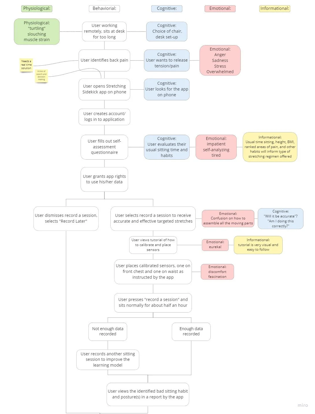 Our client, the 'Sitting Sidekick' team, led by William Liu, was developing an app aimed at improving users' sitting habits to address the health problems associated with prolonged sitting, which will monitor body movement and sitting posture using IMU sensors powered by machine learning models. Our task was to design the interactive side of the product, guiding users through self-assessment and offering personalized stretching advice to help alleviate discomfort and promote better sitting habits.