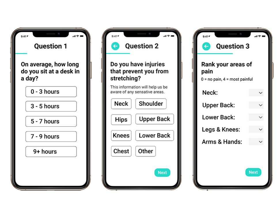Users provide info about their sitting habits, areas of pain, injury history, etc., when signing up. The system wiill then calculate and recommend a regimen based on the user data.