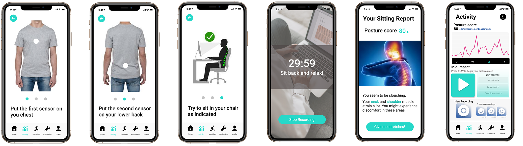 Users sit for a 30-minute session with the sensors on. The process provides users a brief report that help them identify problems in their sitting habit and recommend target stretches. The stretches will be automatically added to the user’s stretching plan shown on the homepage.