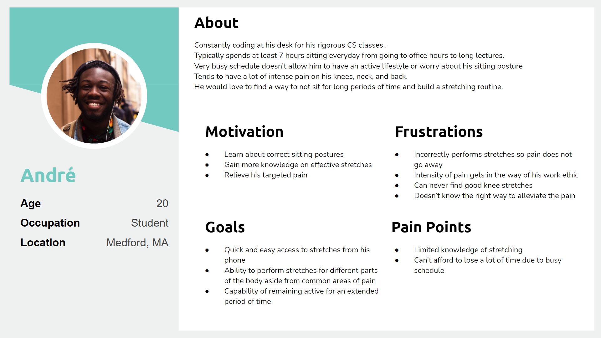 Our team aims to address the problems brought by this sedentary lifestyle by designing a stretching sidekick, Flexa. With IMU and EMG sensors, the app will help users identify problems in their sitting postures and behaviors. It will then recommend solutions that target the users’ areas of pain by providing stretching regimens and a library of stretches users can select from.
