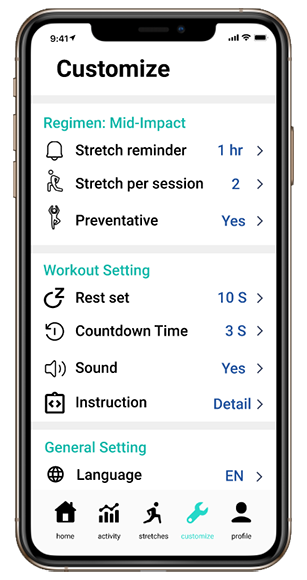 Users can customize the intervals between stretches, duration of stretches, frequency of notification, etc.