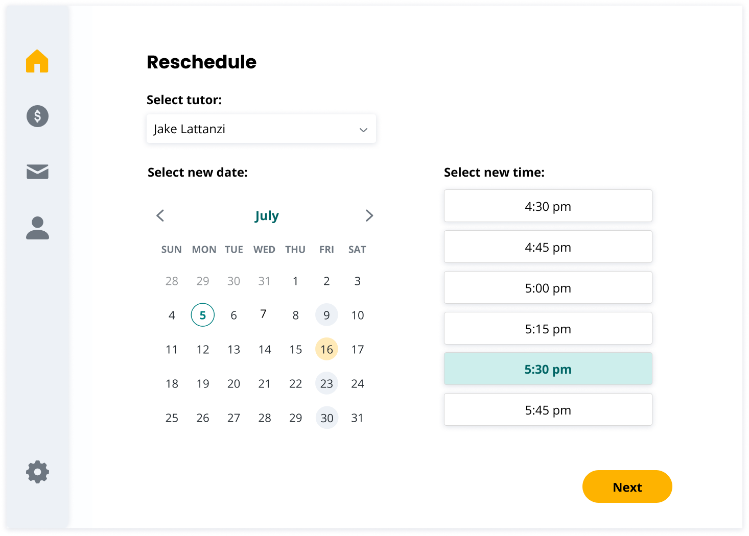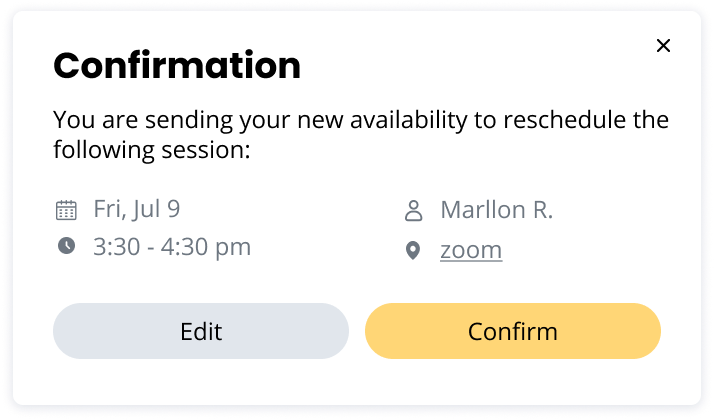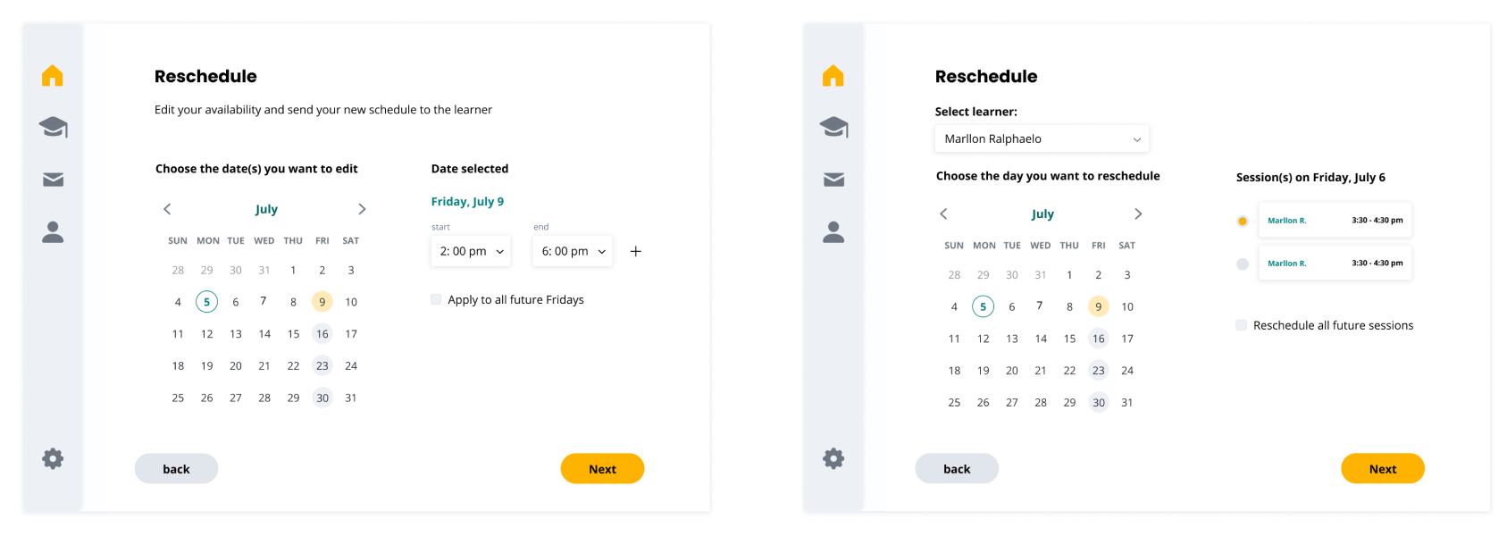 Tutors can view all their sessions for a selected date. When rescheduling, the system first prompts them to update their availability. Once confirmed, learners will receive a request to select a new time based on the tutor’s updated availability.