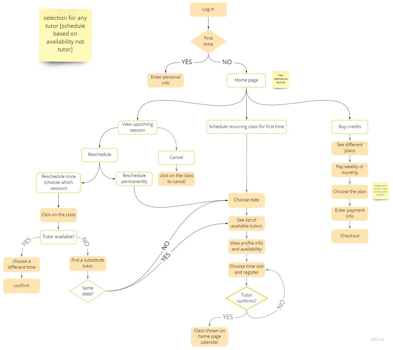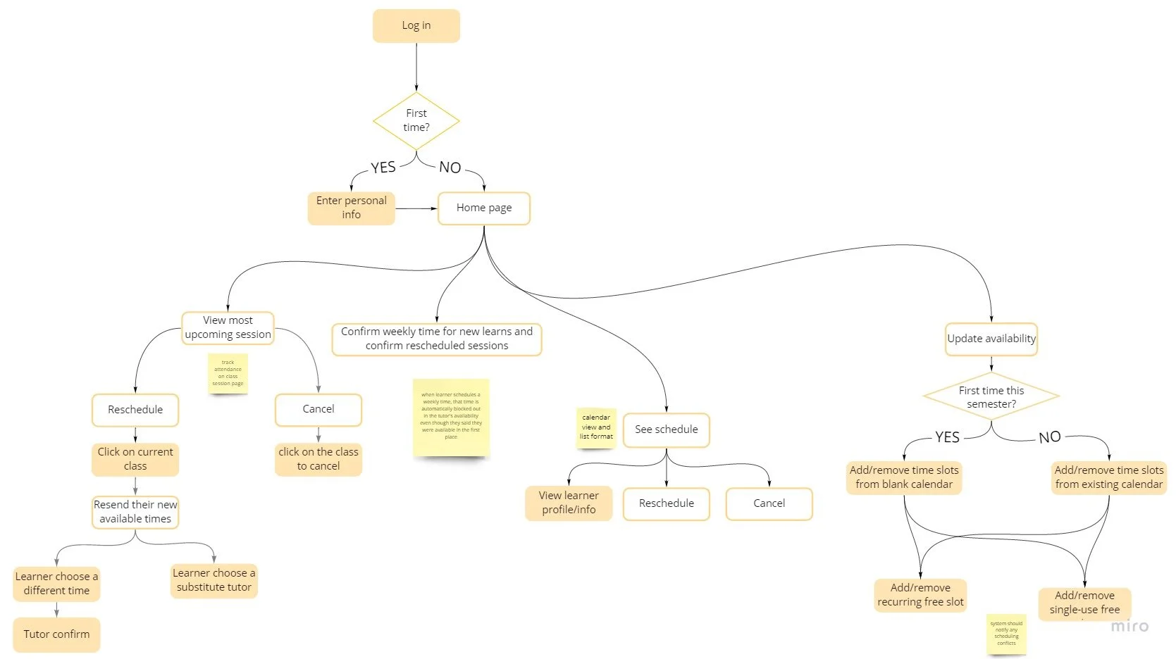 To cater different user needs, we split the app into tutor’s view andlearner’s view. We created a feature list and a user flow chart outlining possible user tasks and decisions, which served as a crucial reference for subsequent design stages.