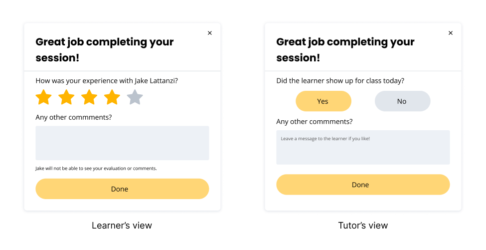 After each session, a pop-up window will appear for learners to rate the session and provide feedback for quality improvement, which will not be visible to tutors.