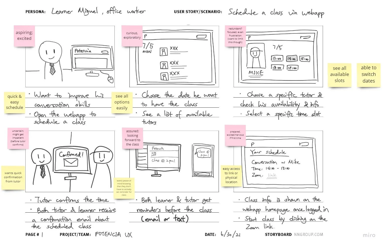 After identifying users’ needs, I created a storyboard to visualize how we expect users to interact with the web app. I also analyzed the overall user experience by identifying potential emotional and cognitive reactions at each step.