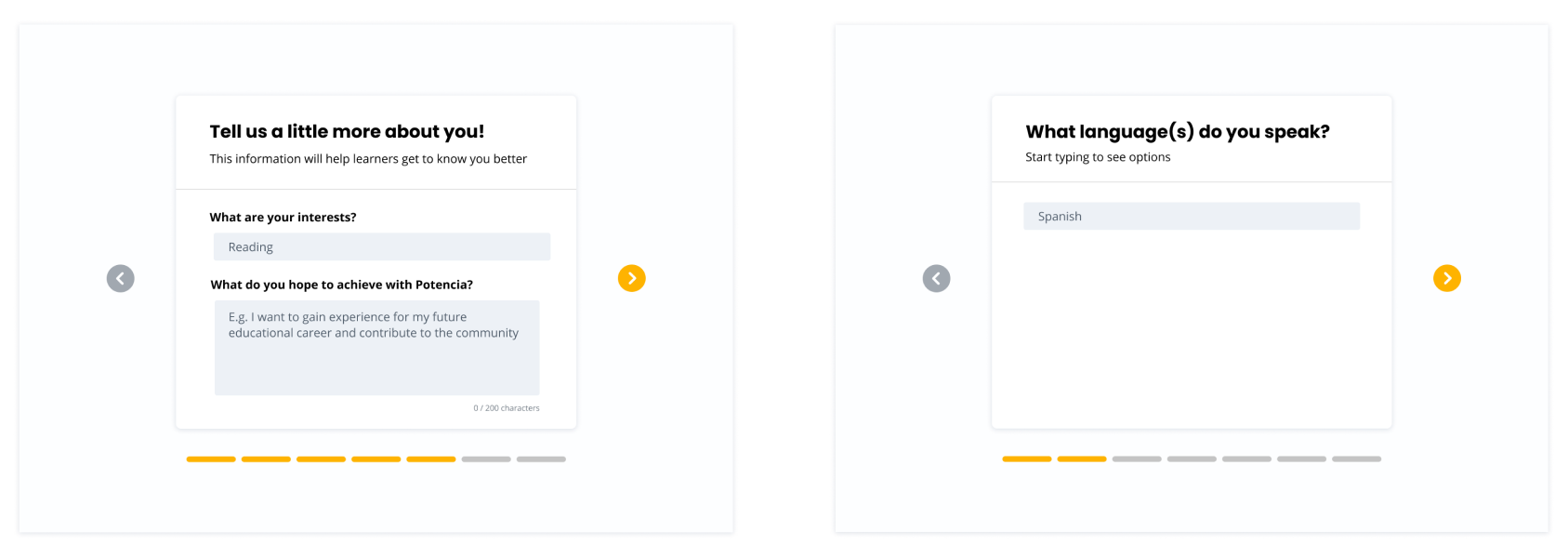 The questions varies based on the user type (learner/tutor). Info such as interests and goal will be displayed on the user profile page.