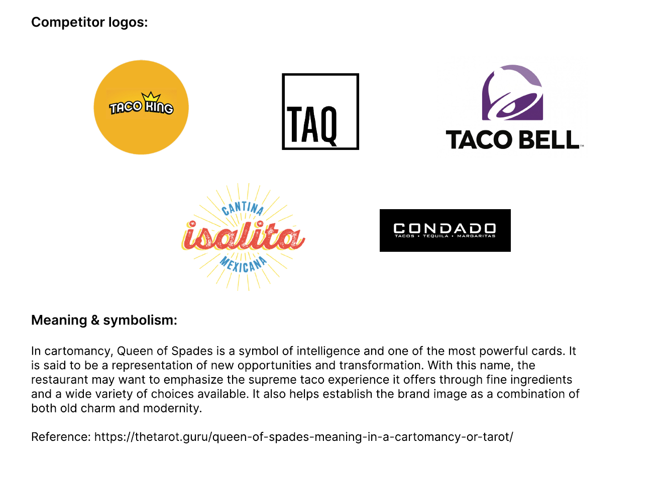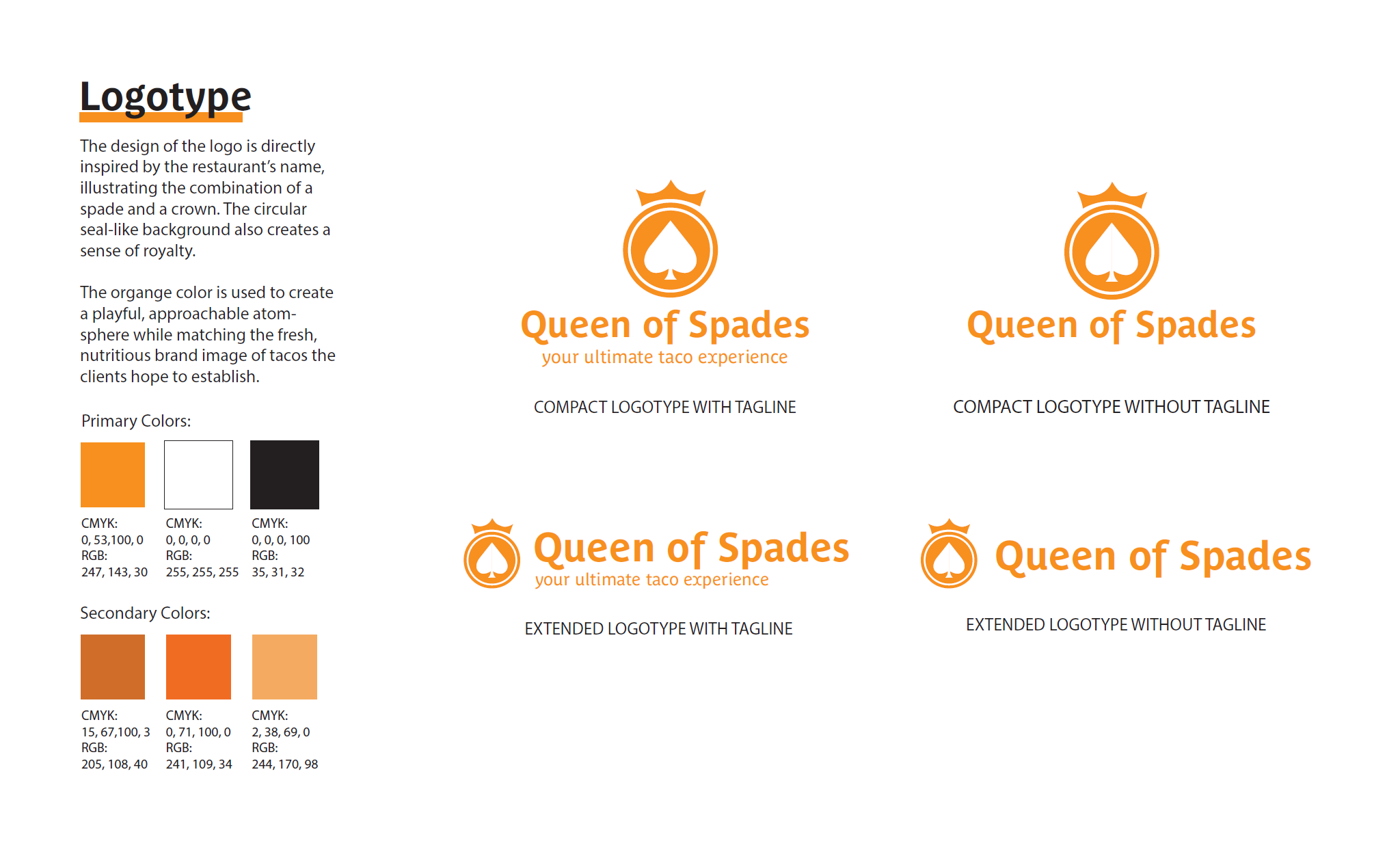 The topic of this course project is to design a logotype for an imaginary Mexican restaurant called Queen of Spade. The logotype is expected to used for printed and digital products. I created a identity style guide in Illustrator as the final deliverable.
